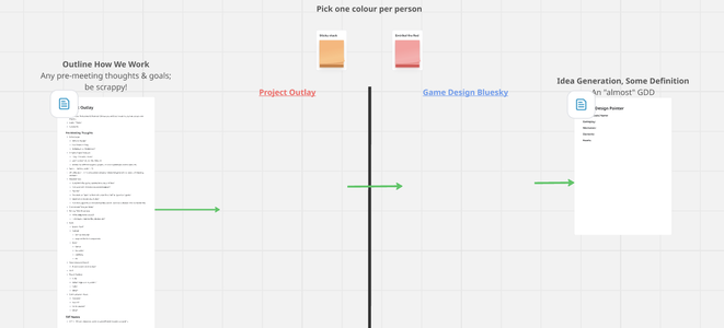 First a bluesky of what we want - then we filter it down into something tangible and actionable. Working towards a GDD - a Game Design Document.